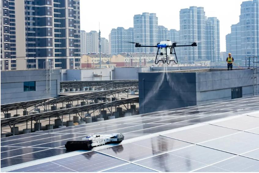 参观当日,在园区屋顶,无人机配合着智能清洗机器人正在对光伏电站进行着清洗工作,高压水流配合电动滚刷,在保证组件清洁度的同时减少人工高危作业。