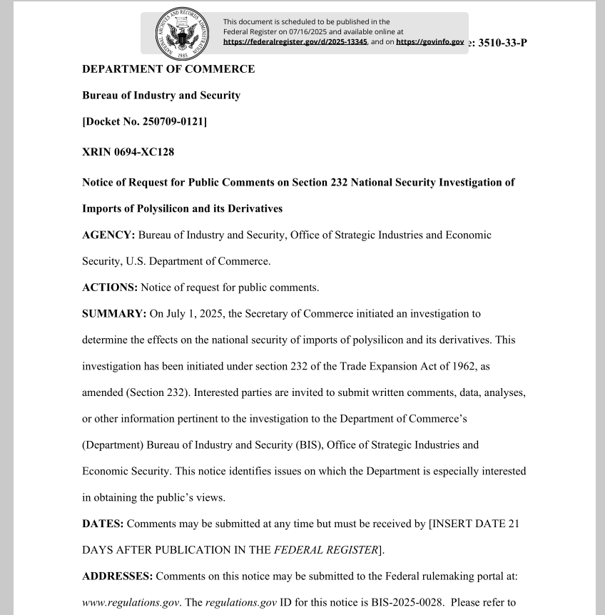 据最新消息,当地时间7月14日,美国商务部工业与安全局(BIS)在联邦公报上公布了两份重要文件,正式宣告启动针对进口多晶硅及其衍生物、进口无人机及零部件对国家安全影响的调查。