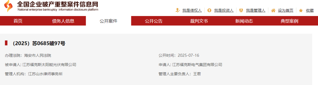 全国企业破产重组信息网显示,有两家光伏企业被申请破产。一是公开时间为9月22日,陈某对熊猫光伏科技有限责任公司申请破产;二是公开时间在2025年9月28日,乔某对阜阳荣联光伏科技有限公司申请破产。工商信息显示,江阴爱索拉科技有限公司、保定嘉盛光电科技股份有限公司、许某分别持有熊猫光伏75%、15%和10%股份。荣联光伏的法定代表人刘某某则有3条被限制高消费记录。
