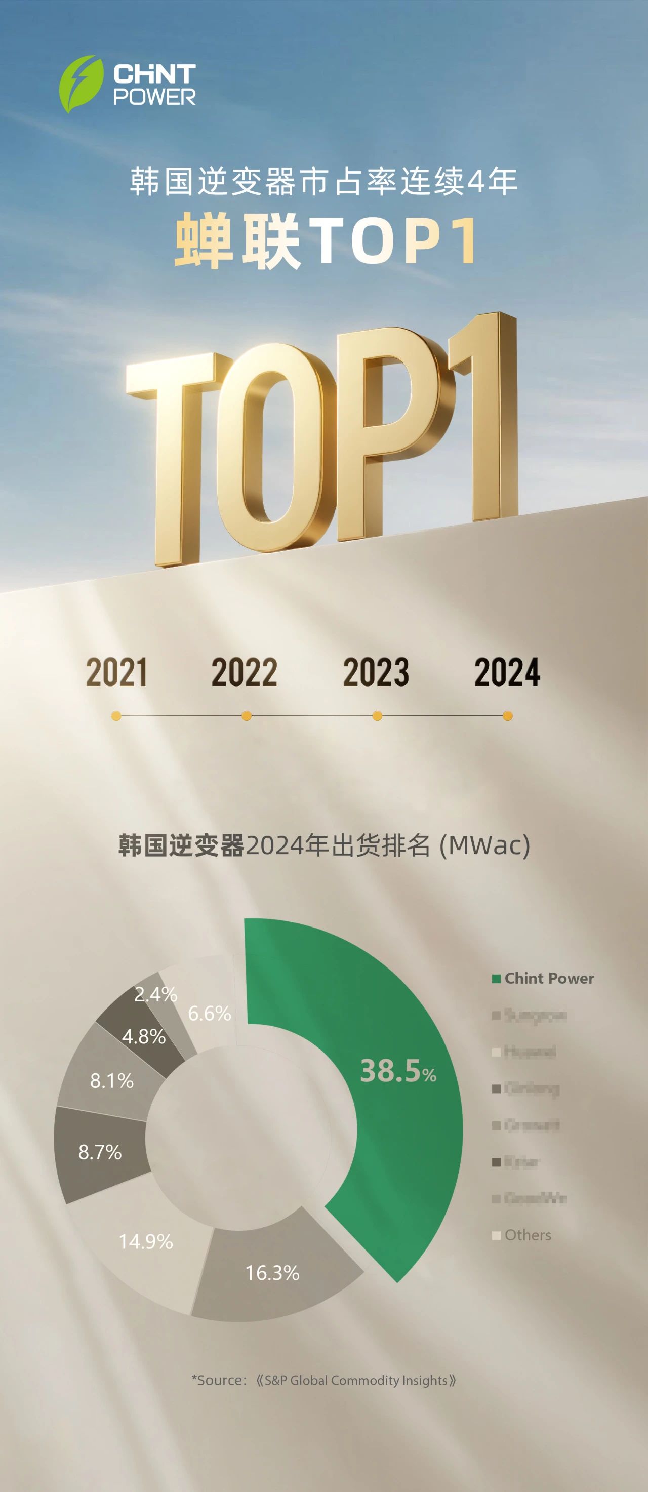 近日,全球权威调研机构S&P Global Commodity Insights最新数据显示,2024年正泰电源在韩国逆变器市场份额38.6%,同比增长9.6%,位居韩国逆变器市场Top 1。