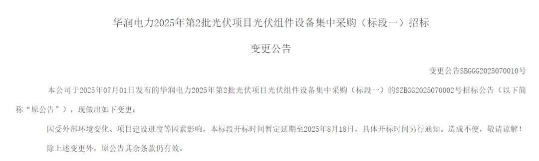 7月15日,华润电力宣布,公司2025年第2批光伏项目光伏组件设备集中采购开标时间暂定延期至2025年8月18日,具体开标时间另行通知。原因为受外部环境变化、项目建设进度等因素影响。