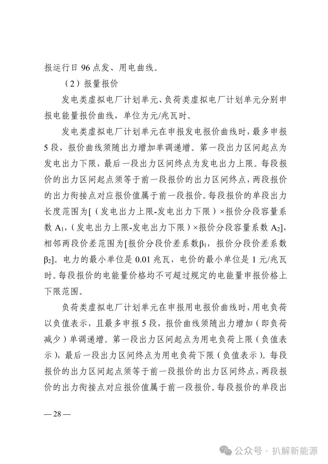 (1)电能量报价,单位为元/兆瓦时。独立储能在申报充放电报价曲线时,充电功率以负值表示,放电功率以正值表示,充电和放电工况分别最多申报5 段,报价曲线须随出力增加单调递增。第一段出力区间起点为最大下网电力,最后一段出力区间终点为最大上网电力,每段报价的出力区间起点须等于前一段报价的出力区间终点,两段报价的出力衔接点对应报价值属于前一段报价。充电工况的单段出力长度范围为[最大下网电力×报价分段容量系数A1,最大下网电力×报价分段容量系数A2],放电工况的单段出力长度范围为[最大上网电力×报价分段容量系数A1,最大上网电力×报价分段容量系数A2],相邻两段价差范围为[报价分段价差系数β1,报价分段价差系数β2],且出力区间不得跨越充电、放电工况。电力的最小单位是0.01 兆瓦,电价的最小单位是1 元/兆瓦时。每段报价的电能量价格均不可超过规定的电能量申报价格上下限范围。