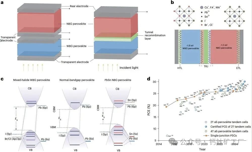 图 1 | a,全钙钛矿叠层电池分为 2T 和 4T 架构;b,2T 架构下的钙钛矿材料与工作原理;c,离子掺杂调控带隙与能级示意图;d,2T 和 4T