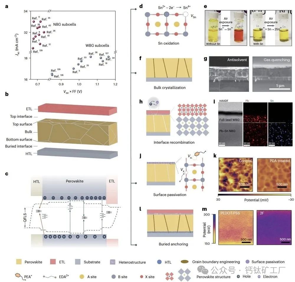 图2 | 提升反式钙钛矿电池效率的策略 a. 串联结构中宽窄带隙子电池的统计性能参数。b. 钙钛矿太阳能电池的结构解析示意图。c.