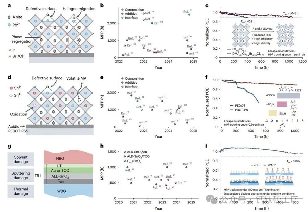 图3 |全钙钛矿叠层光伏的运行稳定性解析 a-c, 宽带隙子电池稳定性问题及解决策略。d-f, 窄带隙子电池稳定性问题及解决策略。g-i,