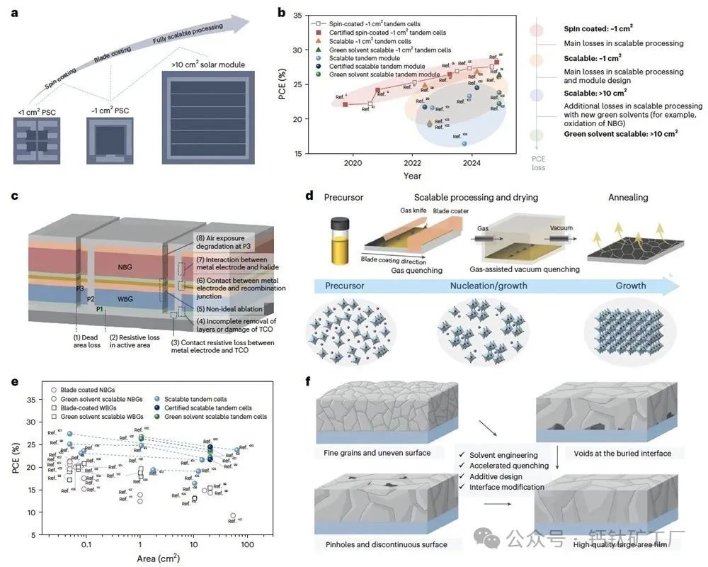 图4 | 全钙钛矿叠层电池的规模化制备 a. 从小面积(<1 cm²,旋涂)扩展至大面积(约1 cm²,可采用旋涂、刮涂或完全可扩展工艺)或模块级尺寸(>10 cm²,仅采用可扩展工艺)的制备路径示意图。b. 约1 cm²面积的全钙钛矿太阳能电池和小型模块的光电转换效率演化历程。c. 串联互连结构的全钙钛矿太阳能模块示意图,以及模块设计中可能存在的几何损耗类型总结。d. 大面积钙钛矿薄膜的可扩展制备工艺示意图,重点突出结晶过程的关键调控环节。e. 基于刮涂工艺的单结与全钙钛矿叠层PSC及其模块的PCE进展。f. 大面积钙钛矿制备中常见的结晶问题及其缓解策略示意图