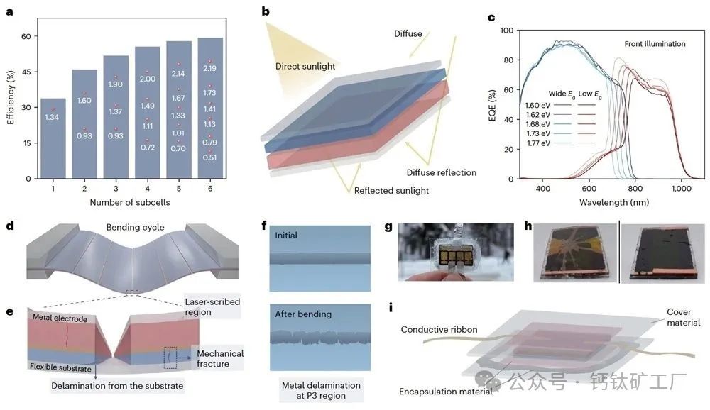 a,多结电池在不同子电池数下的理论效率极限。b,双面叠层器件的能量采集示意图。c,双面全钙钛矿叠层中不同子电池带隙匹配下的EQE线。d,柔性器件弯曲测试示意图。e,柔性叠层器件弯折后的裂纹与层间剥离示意。f,弯折后柔性器件P3区域金属剥离示意。g,一步法封装的PDMS器件实物图。h,乙烯-醋酸乙烯酯(左)和虫漆(右)封装器件经冰雹冲击后的照片。i,钙钛矿器件封装结构示意图。
