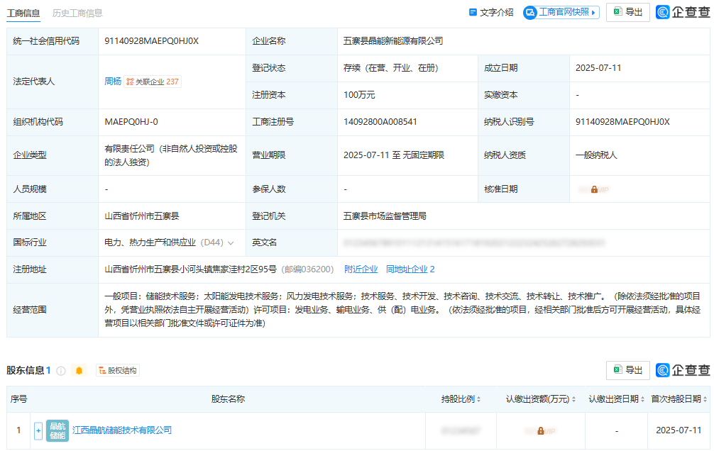 近日,五寨县晶能新能源有限公司成立,法定代表人为周杨,注册资本100万元。