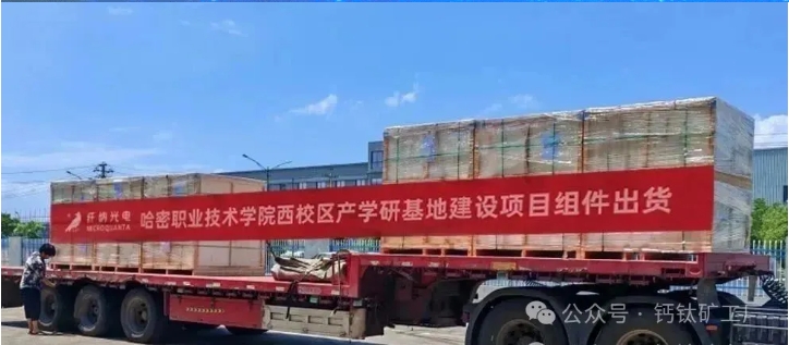 近日,纤纳光电成功出货哈密职业技术学院西校区产学研基地建设项目,共为哈密职业技术学院送去734片钙钛矿彩色组件,用于建设光伏幕墙。目前,组件已顺利送达项目地,即将投入安装。