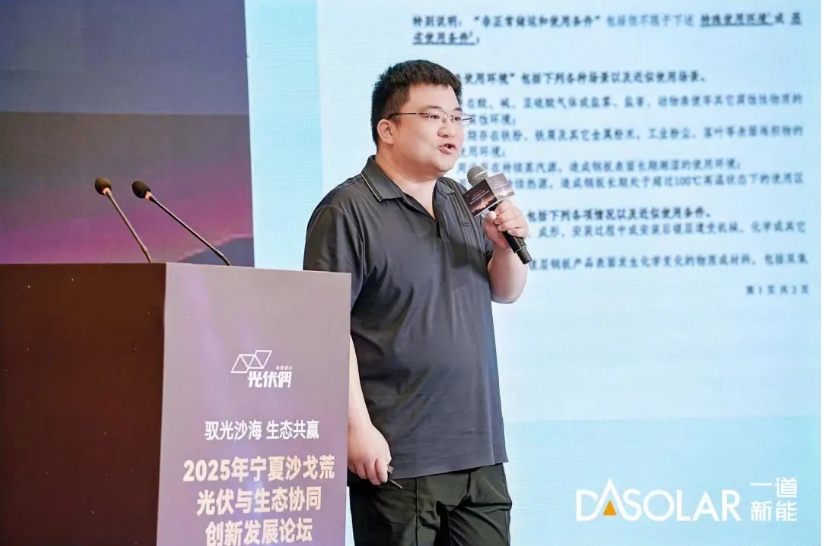 会上,一道新能柔性支架新品“随影”正式发布,公司应用技术部总经理何春涛发表《一道新能沙戈荒解决方案介绍》主题报告。他指出,光伏发电与生态保护深度融合的创新模式成为生态光伏发展的关键抓手,在复杂地形适应、复用土地、生态环境保护等方面强势突围,特别是在沙漠地区正逐步成为推动高经济性绿色发展之道。柔性支架经过十年的更新迭代,已从高价值的特殊定制产品,逐步发展成为可以与传统支架同场竞技的产品。对比传统刚性支架,一道新能柔性支架具有大跨距优势,由传统的地面密布进阶至创新性空中集约,千米级跨度大幅降低桩基数量,兼具成本控制、环境保护、场景适配优势,实现多维价值阵列。