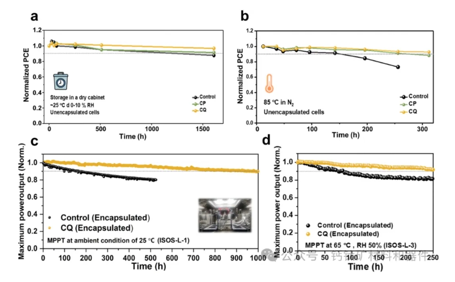 使用这种晶体薄膜的太阳能电池实现了 25.2% 的光电转换效率(PCE)。光电转换效率是指将太阳能转化为电能的有效性。这一数字比不使用添加剂的对照组(23.0%) 高出约 9.6%。此外,在模拟真实工作环境的最大功率点跟踪 (MPPT) 条件下,它们在1000小时内保持了90%