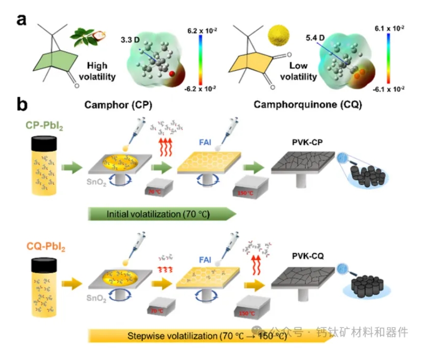 太阳能电池中使用的钙钛矿薄膜制备时,科学家们倾向于寻找大晶体尺寸和均匀排列,以允许电子平稳流动和坚固的结构。添加剂常用来制造这种高质量的薄膜,但如果成膜后仍有残留物,则会导致性能下降。为了解决这个问题,研究团队使用樟脑醌(camphorquinone)作为薄膜添加剂。樟脑醌是从樟脑树中提取的樟脑中加入氧化官能团的物质。它具有像樟脑一样的升华特性,直接从固体转变为气体,但与樟脑不同,它会逐渐升华。在初级热处理过程中,它有助于确保均匀的结晶晶种,其中一些晶种升华,而其余的晶种在薄膜中停留足够长的时间,以便在二次热处理期间完全升华之前生长晶体。