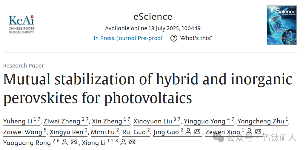 AY. Li, Z. Zheng, X. Zheng, X. Liu, Y. Yang, Y. Zhu, Z. Wang, X. Ren, M. Fu,R. Guo, J. Guo, Z. Xiao, Y. Rong, X. Li, Mutual stabilization of hybrid and inorganic perovskites forphotovoltaics, eScience, https://doi.org/10.1016/j.esci.2025.100449.