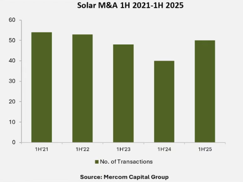 尽管融资规模锐减,但太阳能行业的并购交易却呈现出不同的态势。Mercom Capital 数据显示,企业级和项目级并购交易同比增长 25%,2025 年上半年完成 50 宗交易,而 2024 年同期为 40 宗。同期还达成 106 个光伏项目收购,装机总量 19.9GW,2024 年同期为 113 宗交易/18.5GW。这两组数据表明太阳能项目规模正持续扩大,也反映出大型投资者与项目业主加速整合的趋势。