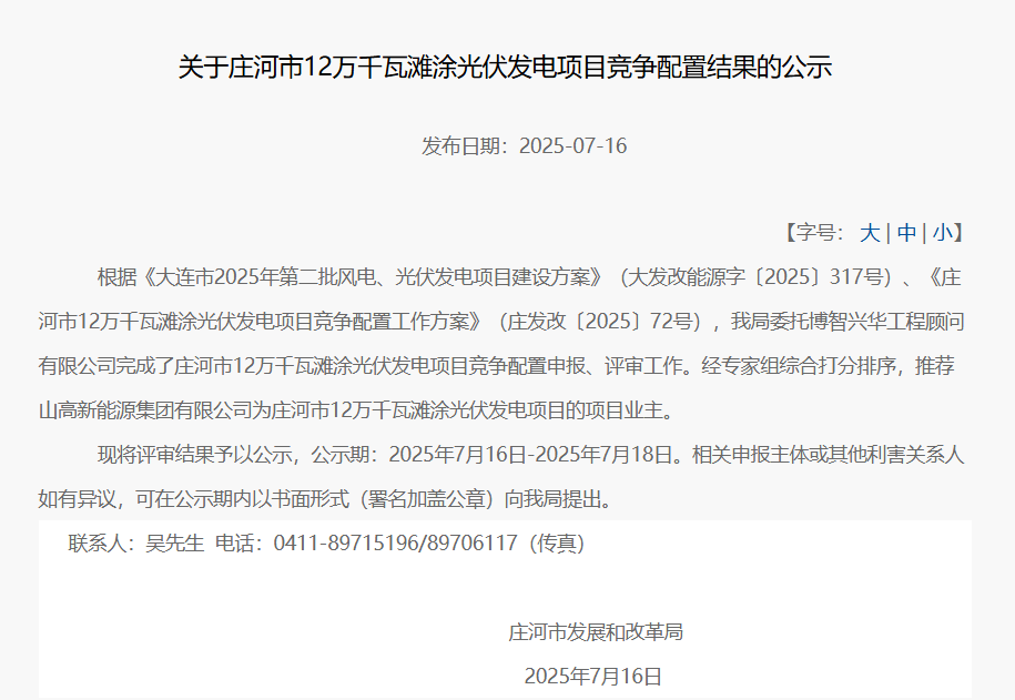 此外,大连市代管的庄河市也发布了12万千瓦滩涂光伏发电项目竞争配置工作结果,山高新能源中标该项目。