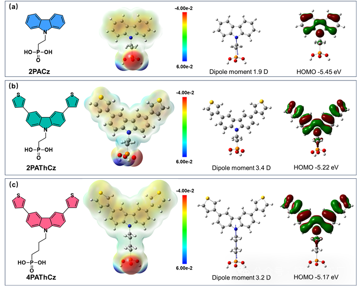 研究结果表明,非稠环的噻吩拓展可以改变SAM的分子堆积行为,促进更致密的π-π堆叠,从而实现了更大的偶极矩、快速的空穴提取能力和减少的电荷复合。此外,烷基链的延长有利于增大分子的溶解性,提高单层分子排列的有序性。因此,基于4PAThCz的D18:L8-BO:BTP-eC9三元器件获得高达20.78%(认证为20.45%)的能量转化效率。该工作为高效SAM的设计提供了新思路。