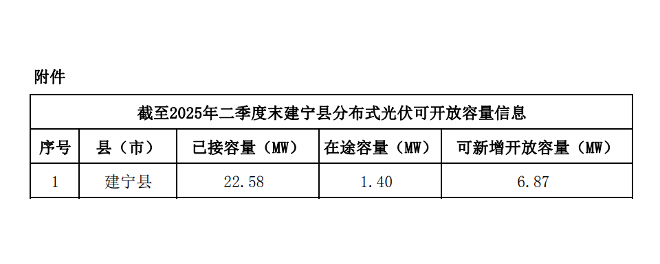你公司提交的《国网建宁县供电公司关于报送建宁县2025年二季度分布式光伏接入电网承载力信息的函》已收悉,经研究,原则同意你公司测算汇总的建宁县供电区域内截至2025年第二季度分布式光伏接入可新增开放容量为6.87兆瓦。在后续分布式光伏项目备案中,我局将加强与你公司信息沟通,有序引导项目单位开展分布式光伏接入申请有关事宜。