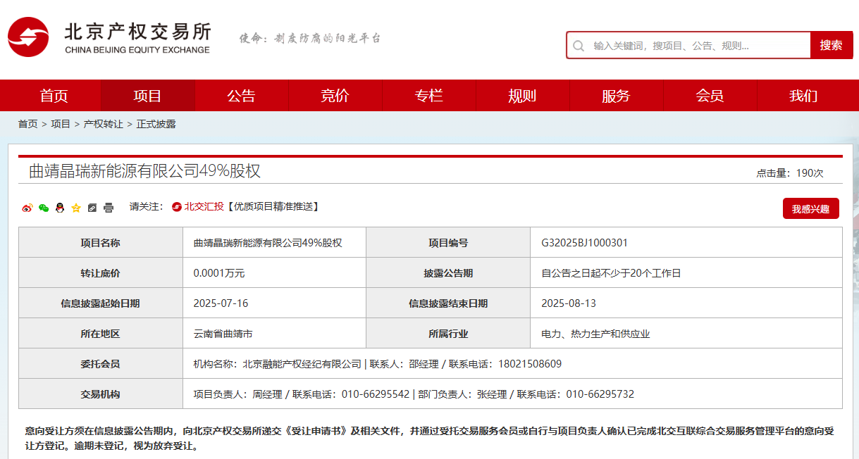 据北京产权交易所网站7月16日正式披露,中国三峡新能源(集团)股份有限公司(以下简称“三峡新能源”)挂牌转让曲靖晶瑞新能源有限公司49%的股权,挂牌价0.0001万元。