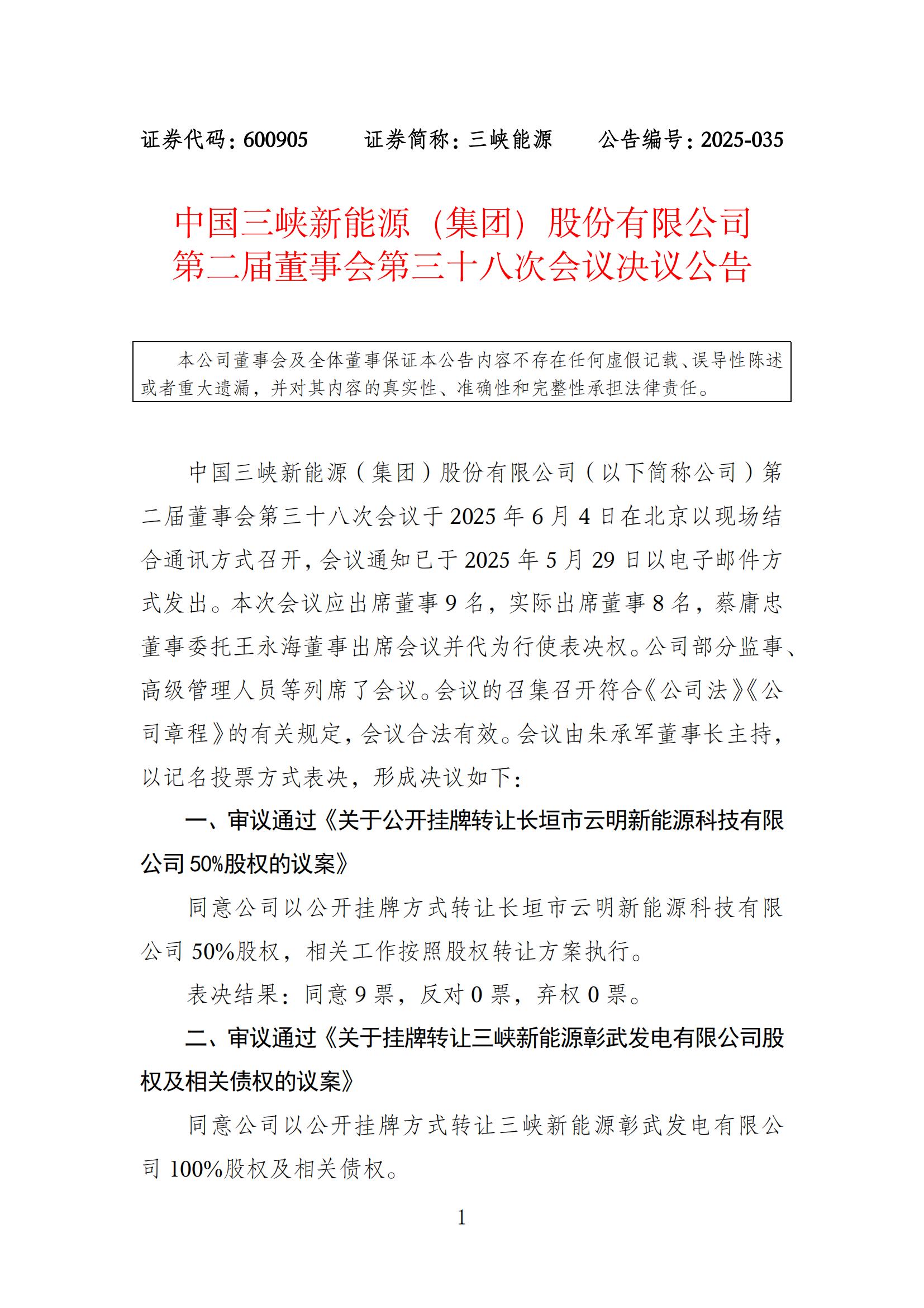 此前,据三峡新能源6月4日召开的第二届董事会第三十八次会议,会议同意公司以公开挂牌方式转让长垣市云明新能源科技有限公司50%股权,同意公司以公开挂牌方式转让三峡新能源彰武发电有限公司100%股权及相关债权。