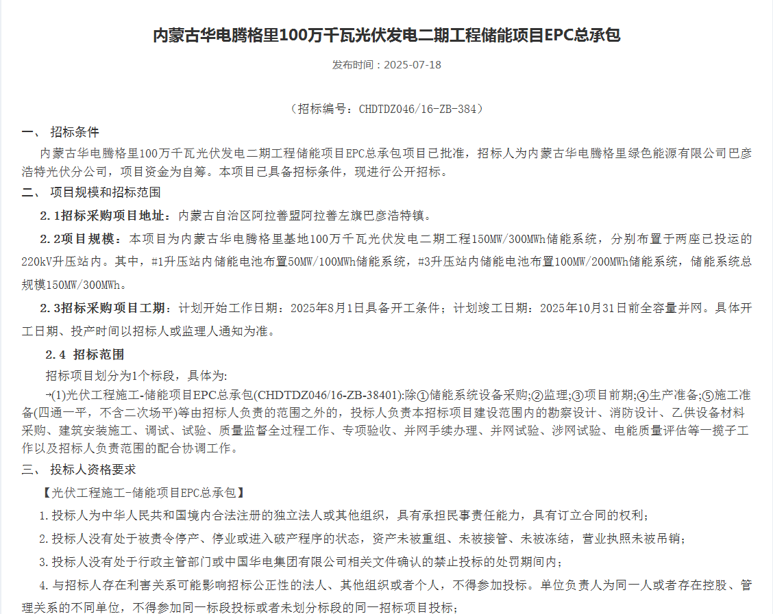 7月18日,内蒙古华电腾格里100万千瓦光伏发电二期工程储能项目EPC总承包招标公告发布。此次招标人为内蒙古华电腾格里绿色能源有限公司巴彦浩特光伏分公司。
