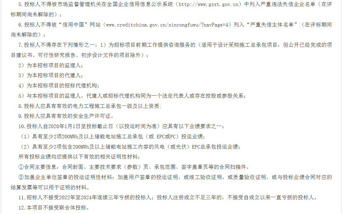 此次招标要求投标人除了拥有良好的经营情况、商业信誉以及相应资质之外,业绩方面投标人自2020年1月1日至投标截止日(以投运时间为准),具备至少2项200MWh及以上储能电站施工总承包(或EPC或PC)投运业绩;或具有至少2项包含200MWh及以上储能电站施工内容的风电(或光伏)EPC总承包投运业绩。