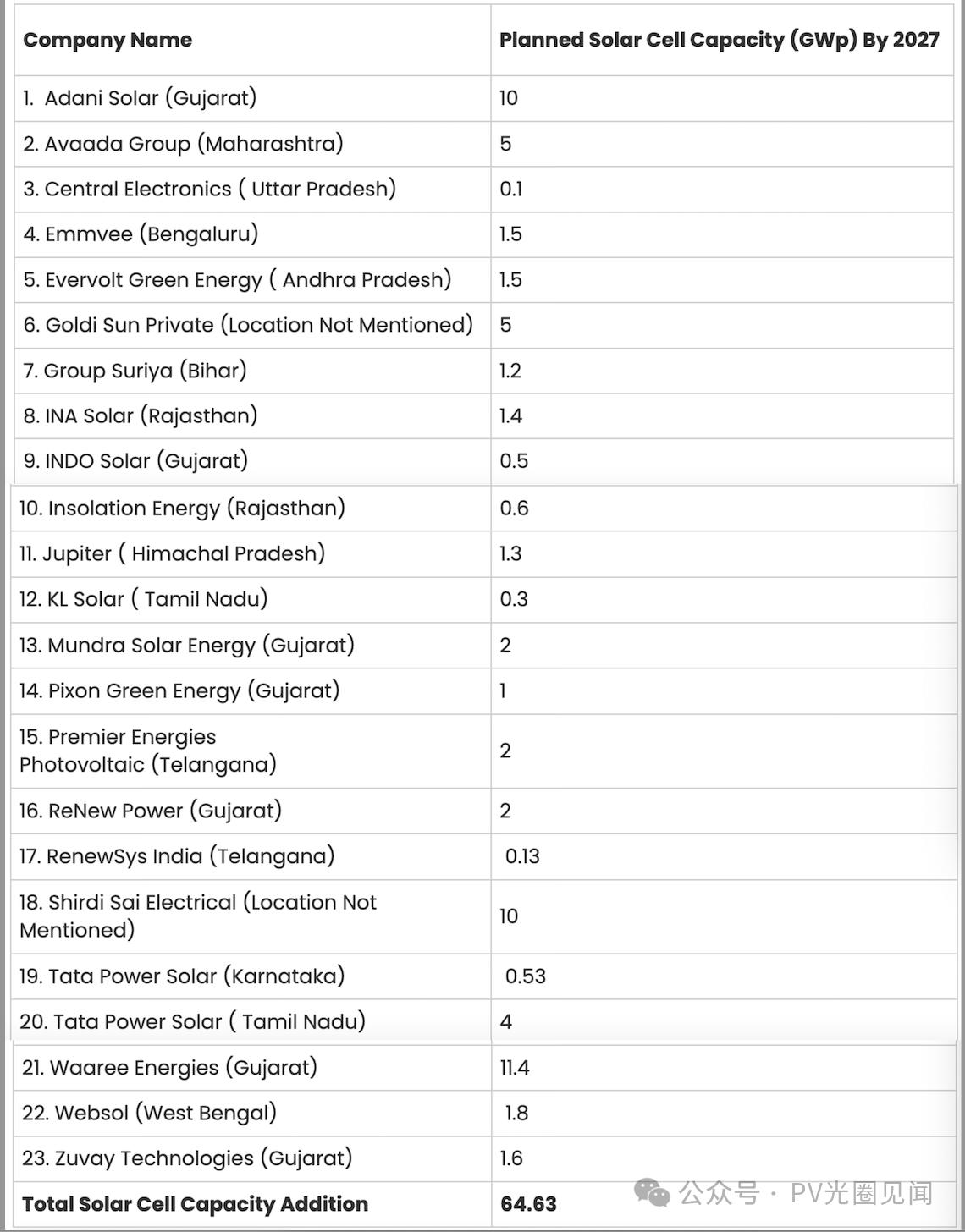 数据还显示,23家企业计划在2027年前新增64.63GWp的电池产能,其中Waaree Energies、Adani Solar和Shirdi Sai Electrical等公司将贡献约10 GWp。