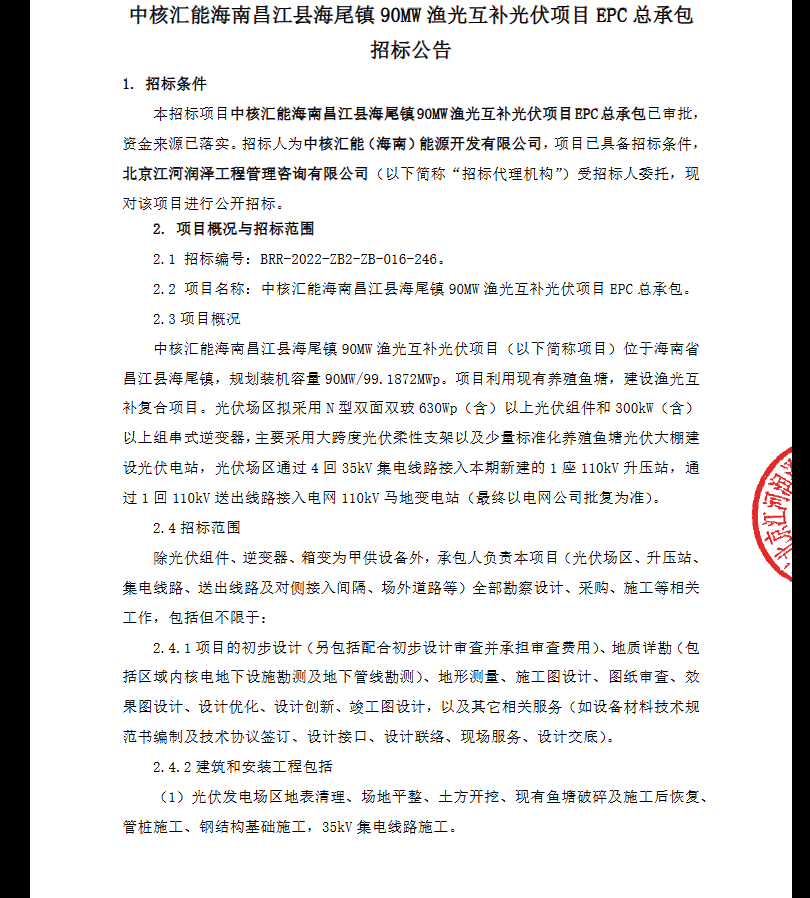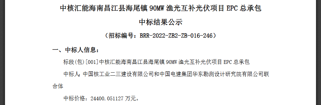 近日,中核汇能海南昌江县海尾镇90MW渔光互补光伏项目EPC总承包中标结果发布。