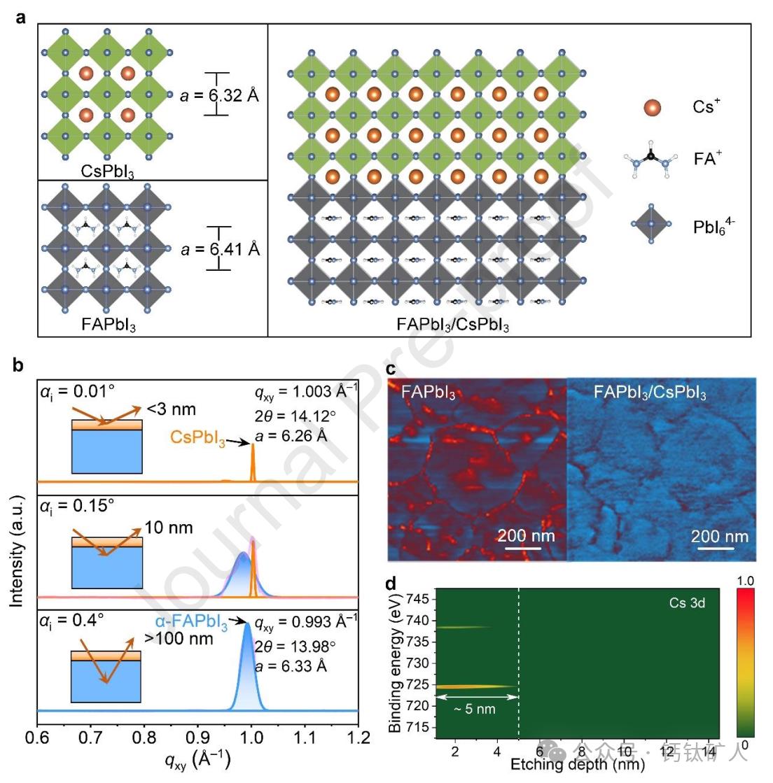 图1. FAPbI 3/CsPbI 3双层策略。(a)双层钙钛矿结构的示意图,(B)入射角为0.01°至0.4°的FAPbI 3/CsPbI 3双层钙钛矿膜的GIWAXS图案。(c)FAPbI 3和FAPbI 3/CsPbI 3钙钛矿膜的AFM-IR图像。(d)FAPbI 3/CsPbI 3叠层的XPS Cs 3d深度分布。