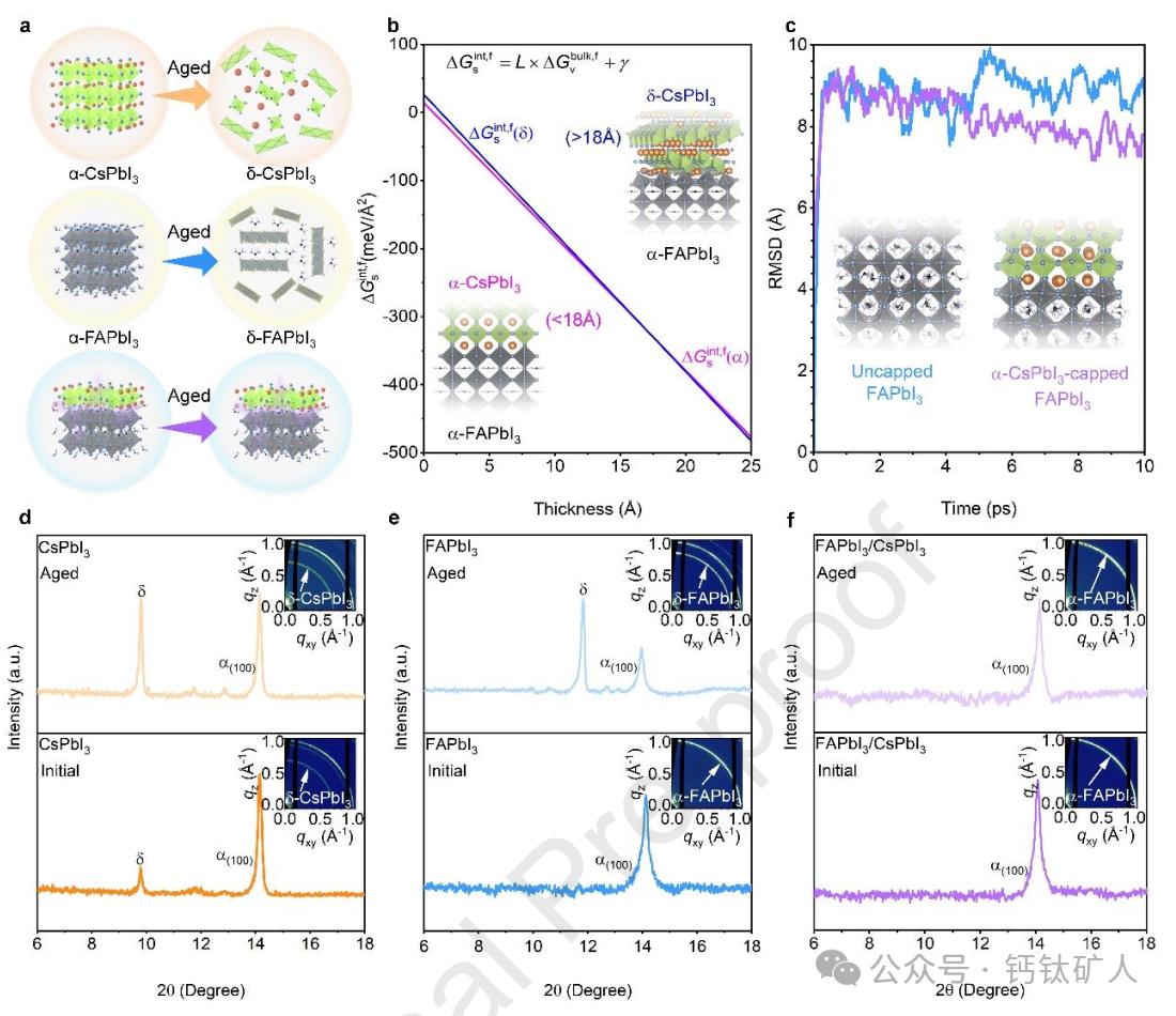 图2. 相互稳定的FAPbI 3/CsPbI 3双层钙钛矿结构。(a)钙钛矿相变和相互稳定性示意图。(B)在立方FAPbI 3(100)衬底上,立方(α)和非钙钛矿(δ)CsPbI 3的形成能随沉积厚度的变化。L为沉积厚度,Δ𝐺 s int,f为单位面积,体积,f v G是每体积CsPbI 3的形成能,γ是界面张力。(c)FAPbI 3和CsPbI 3包覆的FAPbI 3在300 K时的均方根偏差(RMSD)。通过XRD比较(d)ITO/CsPbI 3、(e)ITO/α-FAPbI 3和(f)CsPbI 3在α-FAPbI 3衬底上的相稳定性。插入相应GIWAXS数据的图像。