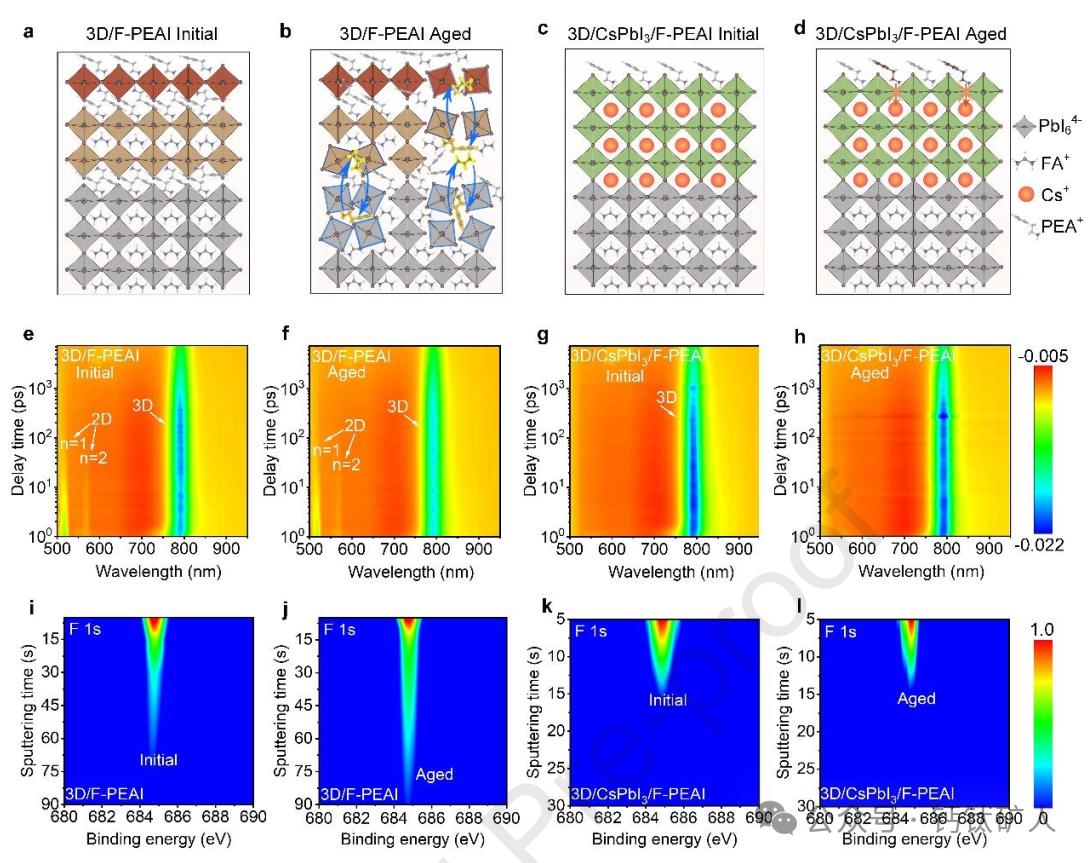 图3. FAPbI 3/CsPbI 3双层钙钛矿策略的界面稳定性效应。(a,b,c,d)FAPbI 3/F-PEAl和FAPbI 3/CsPbI 3/F-PEAl钙钛矿膜中离子迁移的示意图。(e,f)FAPbI 3/F-PEAl和(g,h)FAPbI 3/CsPbI 3/F-PEAl钙钛矿结构在老化之前和之后的原位TA光谱。(i,j)FAPbI 3/F-PEAl和(k,h)FAPbI 3/CsPbI 3/F-PEAl钙钛矿结构的XPS深度分布。l)老化前后的FAPbI 3/CsPbI 3/F-PEAl钙钛矿结构。