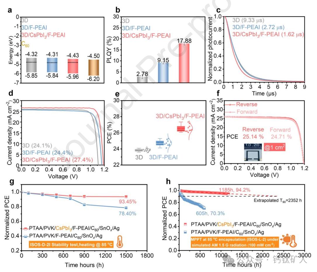 图4. 器件性能和稳定性分析。(a)示意性器件结构能级,(B)PLQY结果。(c)阶跃电压下器件的瞬态电流。(d)反向扫描下不同钙钛矿薄膜的PSC的J-V曲线。(e)基于10个器件的具有不同钙钛矿膜的PSC的PCE的统计。(f)基于FAPbI 3/CsPbI 3/F-PEAI钙钛矿膜的冠军平面大面积(1.0cm2)PSC在AM 1.5G光照条件(100 mW cm-2)下的J-V曲线。(g)封装的FAPbI 3、FAPbI 3/F-PEAI和基于FAPbI 3/CsPbI 3/F-PEAI的器件在85 ℃下1个太阳光照下的稳定性(ISOS-D-2 I)。(h)在85 ℃下用AM 1.5G全光谱在连续1个太阳照射下包封的对照和靶细胞的MPP跟踪(ISOS-L-2)。