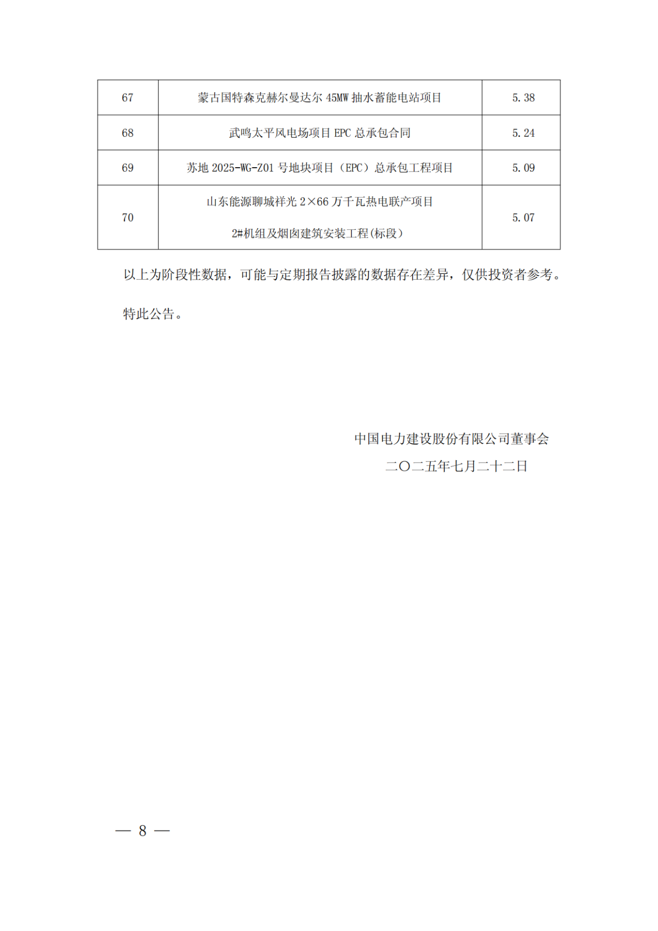 7月22日,中国电建发布公告,2025年1月至6月,公司新签合同金额总计6866.99亿元,同比增长5.83%。能源电力新签项目2939个,业务新签合同金额4313.88亿元,同比增长12.27%。