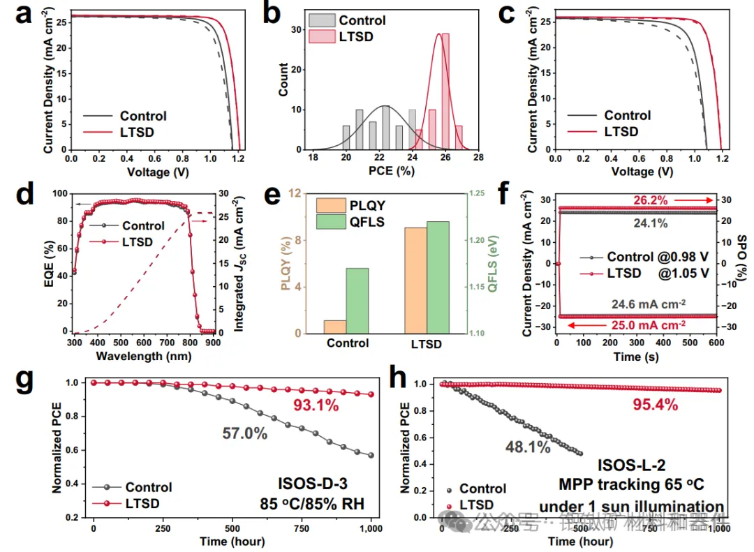 由于开路电压(VOC)的显著增加,器件的功率转换效率 (PCE) 从 24.5% 显著增加到 26.5%(认证效率 26.0%),滞后现象可忽略不计,为包含 SAMs 的反向 PSC 提供当前最先进的性能。封装器件表现出更高的稳定性,在 85°C/85% RH (ISOS-D-3)老化1000小时和最大功率点(MPP)/温度 65 °C (ISOS-L-2) 下跟踪1000小时,器件仍保持 93.1% 和 95.4%的初始效率。