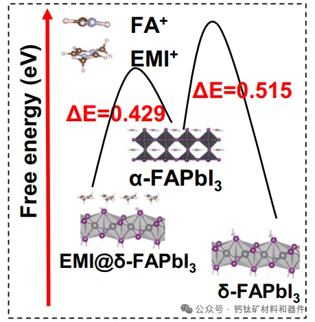 研究团队在 PbI₂ 前驱体溶液中引入了一种定制的 1-乙基-3-甲基咪唑鎓二甲基磷酸盐 (EMI-DMP),它可以与 PbI2 形成多孔络合物框架,以促进有机铵盐的渗透并促进它们之间的充分反应。此外,还发现 EMI-DMP 通过改变表面自由能来降低从 δ 到 α 钙钛矿的能垒,从而在低退火温度下产生完全相变。