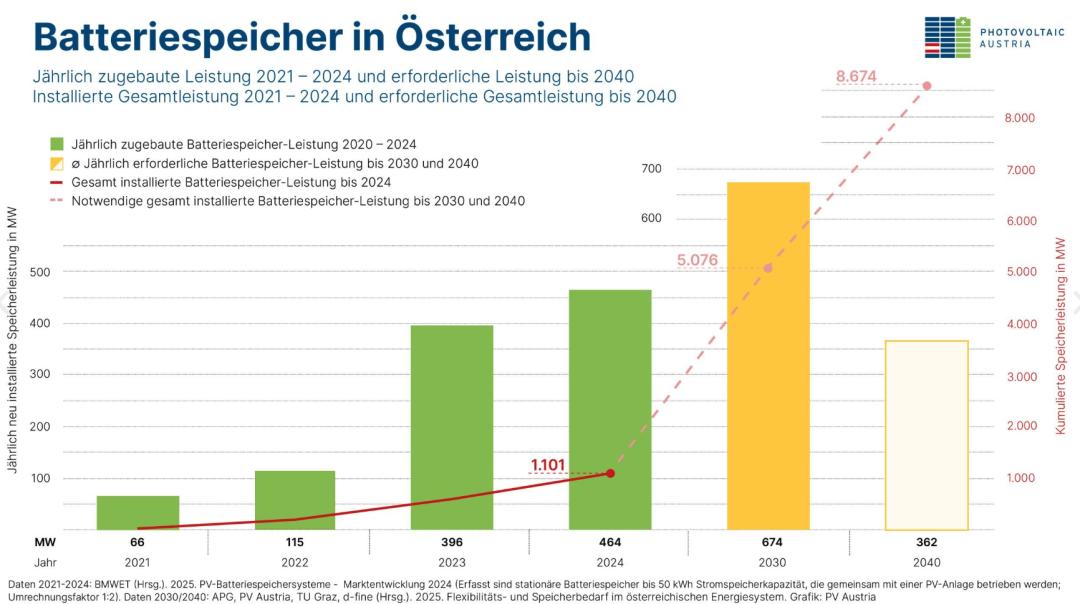 为达成2030年目标,奥地利需在未来每年新增储能容量约650MW;至2040年,年增规模可放缓至每年约350MW。作为对比,2024年实际新增为450MW,当前发展速度仍存在较大缺口。