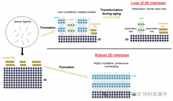 在这种 2D/3D 结构中,2D 夹层由有机-无机杂化物钙钛矿的单层或多层堆叠组成。2D 夹层通过减少材料缺陷的负面影响、控制电子或离子在材料中的运动、产生内置电位、防止离子或电子从环境移动到材料中,并阻止离子迁移,从而保护堆栈中的 3D 钙钛矿。这种夹层提高了器件光电转换效率和器件稳定性。随着器件老化,二维夹层会以不同的方式演变,从而改变器件的稳定性。