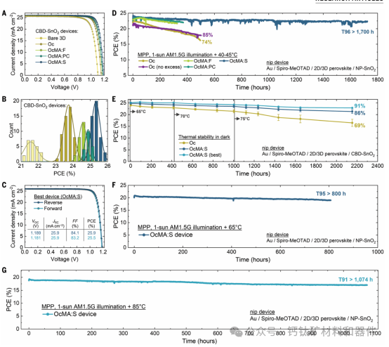 研究人员发现,OcMA:S 的效率达到了 25.9%,与报道最好的单结硅太阳能电池相当。在峰值功率条件下的 85°C 加速测试中,OcMA:S 钙钛矿在 1,074 小时后仍保持了 91% 的初始性能,这是此类钙钛矿器件中最稳定的性能之一。