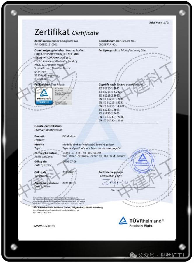 近日,中建科工自主研发的钙钛矿BIPV(建筑光伏一体化)产品一次性通过IEC61215和IEC61730国际标准全项测试,成为全球首个获得TÜV莱茵认证的钙钛矿BIPV产品。
