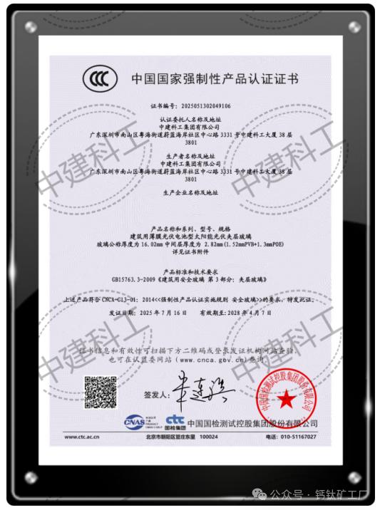 此外,钙钛矿BIPV产品已获得中国国家强制性产品认证(CCC认证),符合GB15763.3《建筑用安全玻璃 第3部分:夹层玻璃》及CNCA-C13-01《强制性产品认证实施规则 安全玻璃》标准要求。