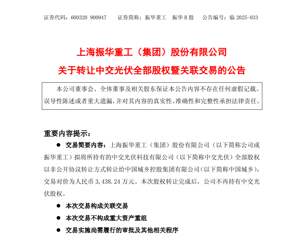 根据公告内容,振华重工拟将所持有的中交光伏科技有限公司全部股权,通过非公开协议转让的方式,转让给中国城乡控股集团有限公司,交易对价确定为人民币3438.24万元。