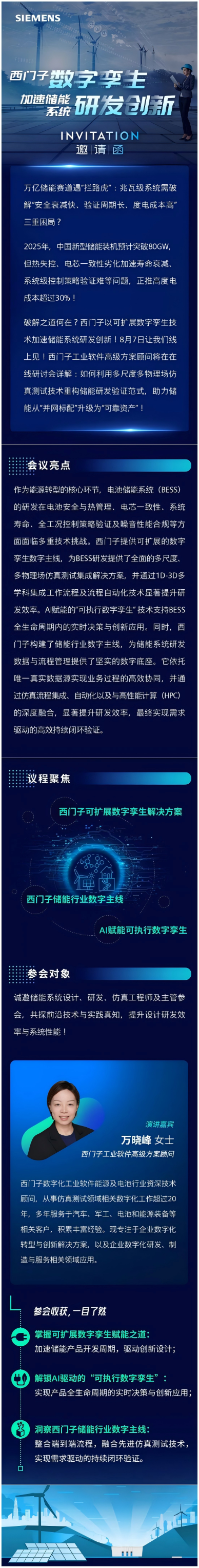 为进一步助力储能系统研发创新加速,西门子数字化工业软件将于8月7日14:00—15:00举行线上研讨会,带来可扩展数字孪生技术。西门子工业软件高级方案顾问将在在线研讨会详解:如何利用多尺度多物理场仿真测试技术重构储能研发验证范式,助力储能从“并网标配”升级为“可靠资产”!