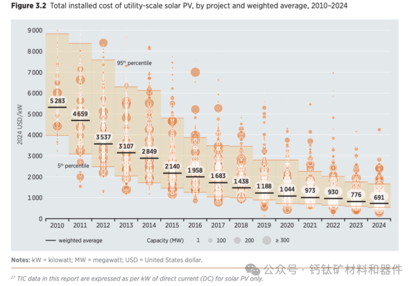2024 年,公用事业规模太阳能项目的全球加权平均总装机成本(TIC)发生更为显着的变化,为 691美元/千瓦,同比下降