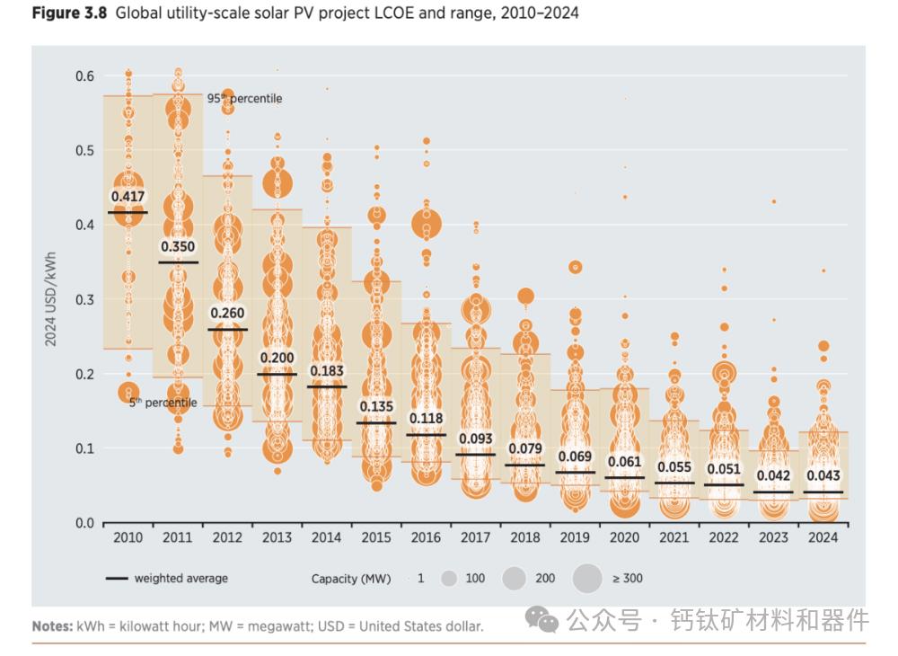 根据国际可再生能源署 (IRENA) 的最新报告,2024年,公用事业规模太阳能电厂的全球加权平均平准化电力成本 (LCOE) 为0.043美元/千瓦时。
