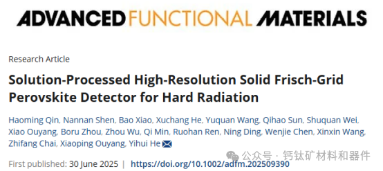 苏州大学何祎辉教授团队在《Advanced Functional Materials》上发表了一项突破性研究成果,首次成功将Frisch栅极结构集成到溶液法制备的钙钛矿半导体中,开发出固态Frisch栅极(SFG)探测器。这一创新设计实现了多项性能突破: