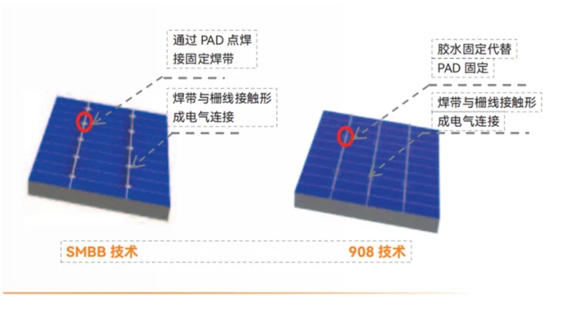 其中,908技术是通威自主研发 0BB 电池技术,是一种新型的组件互联技术。这项技术在2024年完成技术开发,在TNC 2.0产品上首次量产导入。