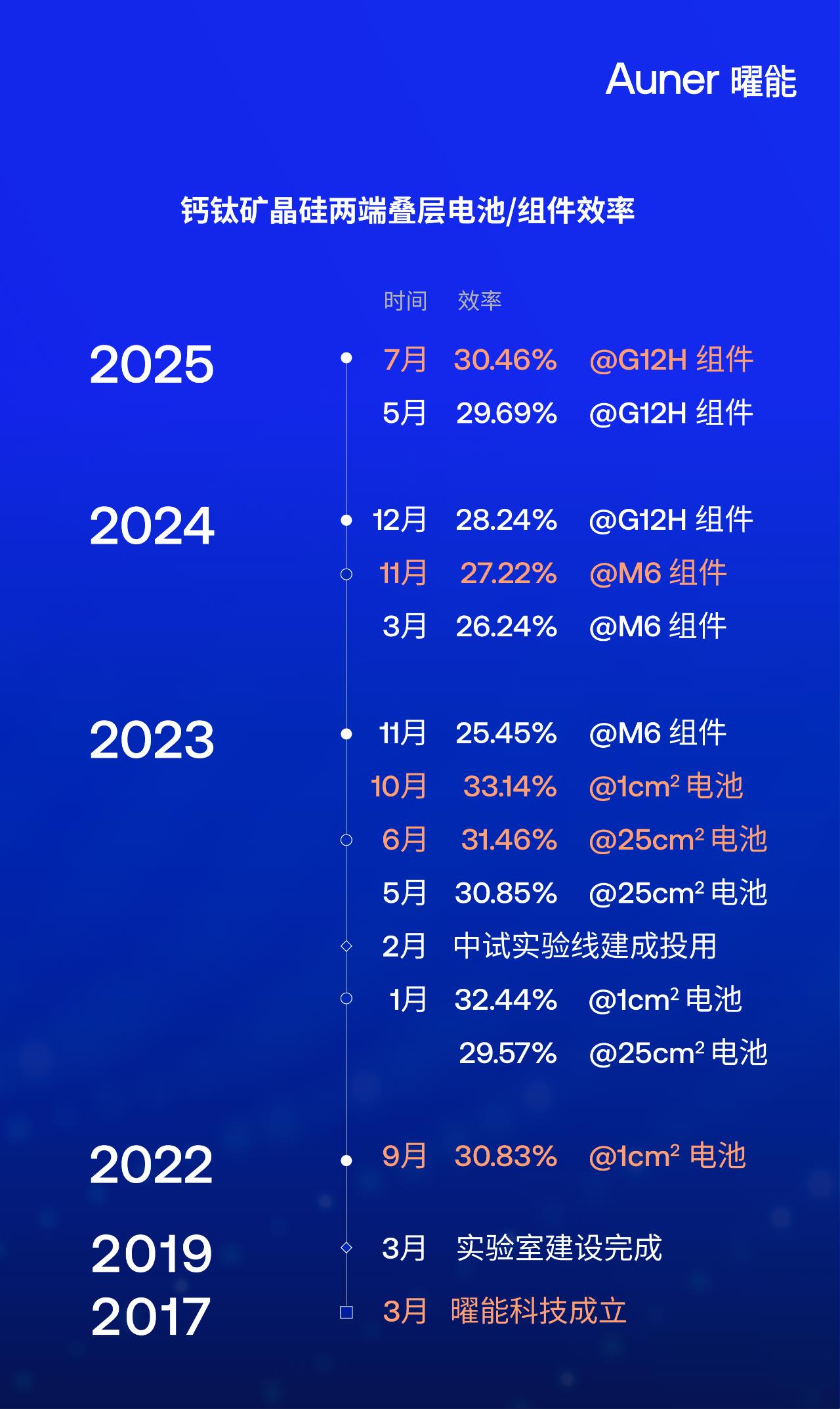 效率突破是光伏行业技术进步的终极标尺。2022年9月,曜能科技以1 cm²钙钛矿/晶硅叠层电池30.83%的稳态认证效率成为国内首个突破“30%+”的企业;时隔仅3年,叠层组件效率突破30%,实现了从“小面积电池”到“工业尺寸叠层及封装技术”的关键跨越。这一成果的意义在于:组件封装必须克服电池互联损失、光学损耗、层压工艺退化等产业化难题,30%组件效率的实现,体现了企业在核心工艺上的实质性进展。