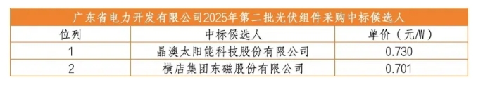 7月26日,中国招标投标网发布广东省电力开发有限公司2025年第二批光伏组件采购中标候选人公示。根据文件,入围该项目的共两家企业,分别为晶澳和横店东磁。其中,晶澳以0.73元/W位列第一,横店东磁报价仅0.701元/W。根据招标文件,本招标项目采购总量暂定124.09MWp。此次采购的组件应用于广东能源梅州平远光伏复合项目(一区)和广东能源葵农场光伏复合项目(二区)。