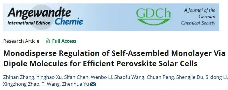 Z. Zhang, Y. Xu, S. Chen, W. Li, S. Wang, C. Peng, S. Du, S. Li, X. Zhao, T. Wang, Z. Yu, Monodisperse Regulation of Self‐Assembled Monolayer Via Dipole Molecules for Efficient Perovskite Solar Cells. Angewandte Chemie International Edition, (2025).