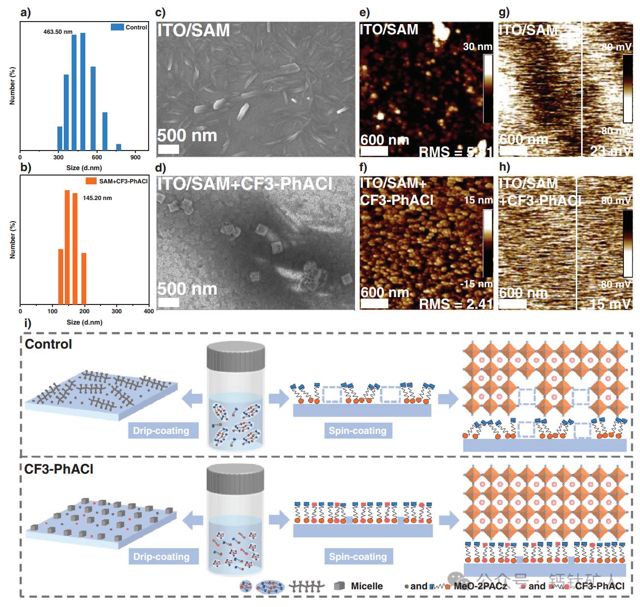 图1. 对ITO/SAM膜和ITO/SAM + CF3-PhACl膜进行了表征。通过DLS表征确定了a)MeO-2PACz和B)MeO-2PACz + CF3-PhACl溶液中的粒径分布,并对c)SAM胶束和d)SAM + CF3-PhACl胶束在室温下干燥的ITO基底上的顶视图SEM照片进行了分析。e)ITO/SAM衬底和f)具有旋涂和退火处理的CF 3-PhACl改性的ITO/SAM衬底的AFM图像。比例尺是600 nm。g)ITO/SAM衬底和h)CF 3-PhACl改性的ITO/SAM衬底的KPFM映射是600 nm。比例尺为600 nm。i)在旋涂和滴涂过程中,在没有和具有CF 3-PhACl改性的ITO基底上SAM胶束从溶液到膜的演变的示意图。