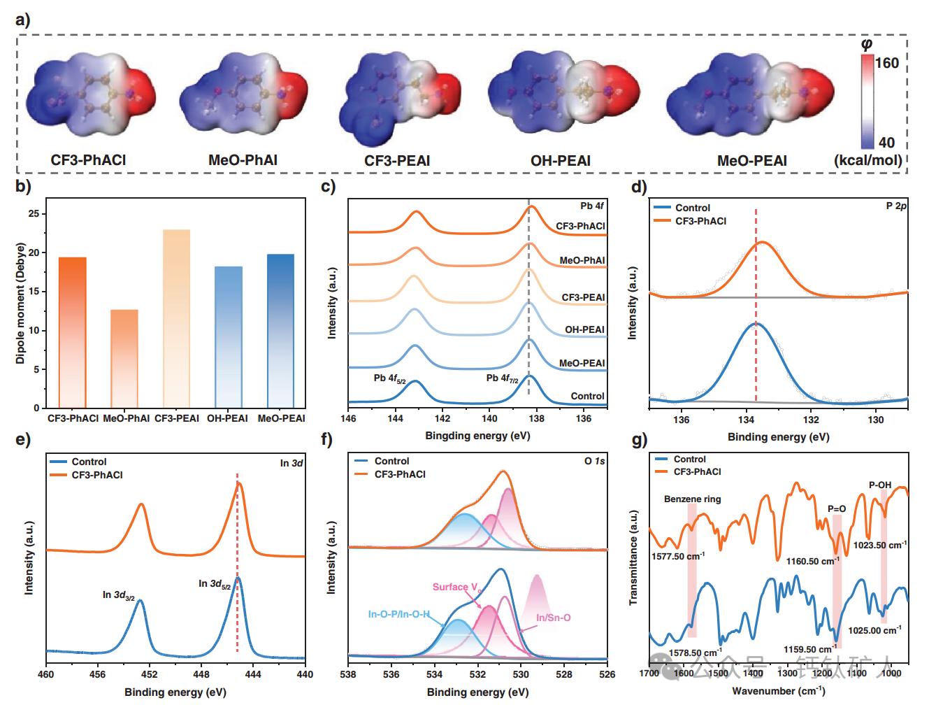 图3. 烷基胺芳族衍生物配体与钙钛矿和ITO/SAM衬底之间的化学相互作用。a)烷基胺芳族衍生物配体的静电势图像。B)烷基胺芳族衍生物配体的偶极矩。c)对照和不同烷基胺芳族衍生物改性的钙钛矿膜的暴露掩埋界面的Pb 4f的XPS光谱。d)P 2 p的XPS光谱,e)In 3d和f)用于ITO/SAM衬底和CF 3-PhACl改性的ITO/SAM衬底的O 1 s。g)MeO-2PACz和CF 3-PhACl + MeO-2PACz粉末的傅里叶变换红外光谱(FTIR)。